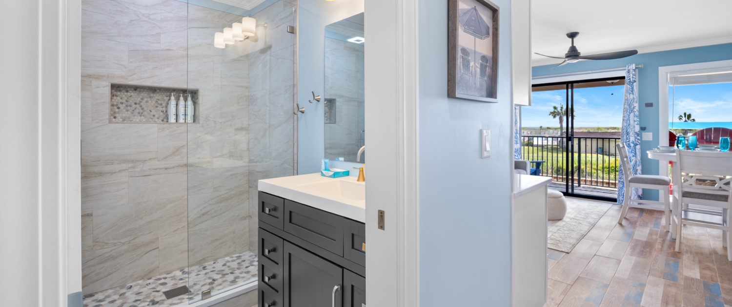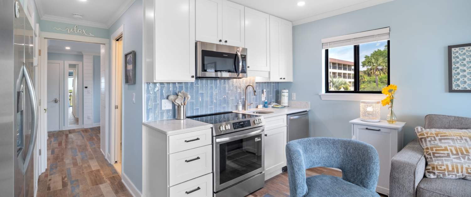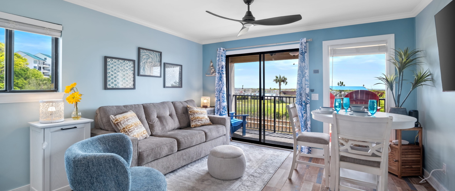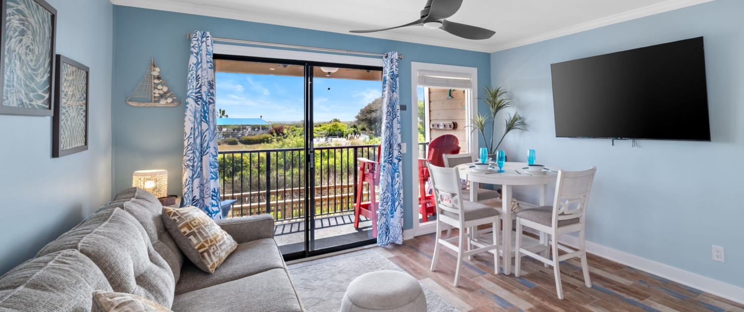 Unit B127 – Ocean Villa – This bright & beachy airy end-unit villa sits on the 1st floor along Ocean Villa B, and super close to the Pool and Boardwalk. Offering extra sunlight, refreshing ocean breezes, and sweeping views of the beach, ocean, and the island’s largest outdoor pool. Enjoy viewing Sunrises from your private patio in the morning!!! From here, you’re just steps away from sinking your toes in the sand and sipping your favorite drink.